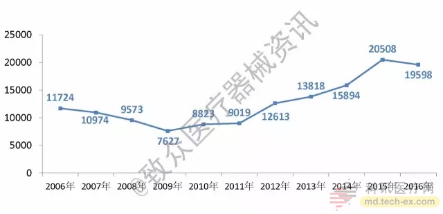 从注册总数上来看,医疗器械市场总量大体呈稳步增长的趋势,只有2015年受新法规实施等因素的影响,出现了明显的下降(见图一)。