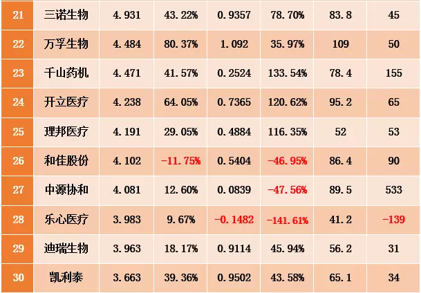 05.营收排行前十位依次为:新华医疗、威高股份、爱尔眼科、迪安诊断、乐普医疗、鱼跃医疗、润达医疗、微创医疗、山东药玻、尚荣医疗。其中,新华医疗营收45.08亿元,位列第一,但也是唯一一家营收同比负增长的企业。润达医疗营收同比增长96%,居增长率第一。
