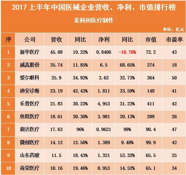 07.市值排行前十位依次为:华大基因、乐普医疗、爱尔眼科、威高股份、鱼跃医疗、贝瑞基因、安图生物、迪安诊断、迈克生物、达安基因。其中,今年刚刚上市的华大基因以市值544亿元击败乐普医疗,成为中国医械企业市值第一。