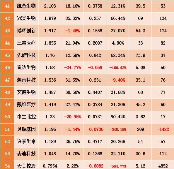 08.市盈率排行前十位依次为:天美控股、中源协和、博晖创新、千山药机、华大基因、冠昊生物、阳普医疗、达安基因、万东医疗、麦迪科技。其中,市盈率最高的天美控股达到了4852,营收方面,有7家企业实现同比正增长,3家同比负增长。