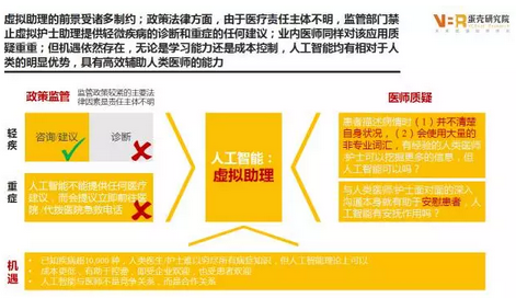 Babylon Health创始人Ali Parsa认为,每年人工处理病患会发生大量误诊死亡事件,有一种说法认为美国ICU误诊死亡达40500人/年,而利用人工智能技术,从虚拟助理切入,能够更准确、更快捷、更安全、更便宜地实现病患处理。但是,目前在政策法律方面,由于医疗责任主体不明,监管部门禁止虚拟助理提供轻微疾病的诊断和重症的任何建议。