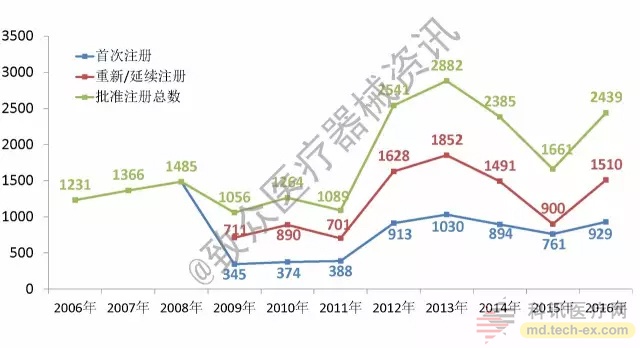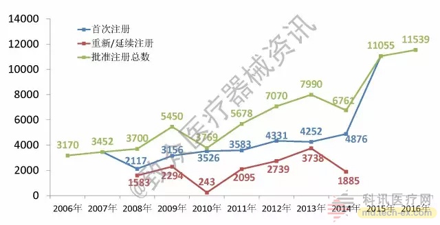 2017年5月23日,国家食品药品监督管理总局发布了2016年度食品药品监管统计年报,小编的朋友圈已被“全国增加十几万家医疗器械经营企业”这一信息点刷爆。但除了企业数量,这几年的医疗器械注册数量也不由得引人关注。小编将总局从第一期到最新一期的监管统计年报中的医疗器械注册数据做了统计分析,从注册量来看医械圈这几年的风云变化: