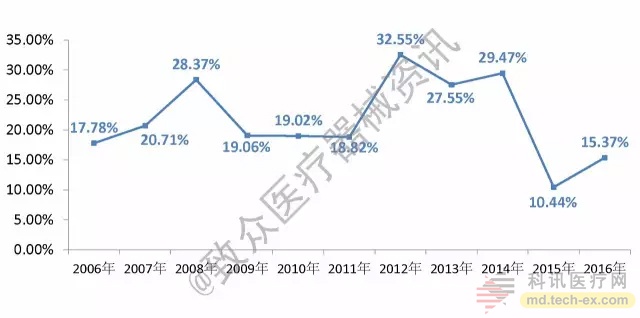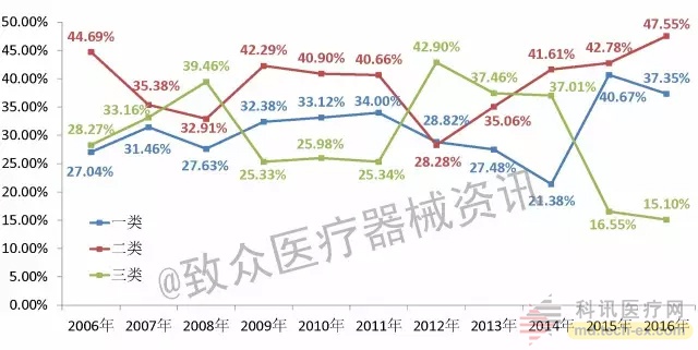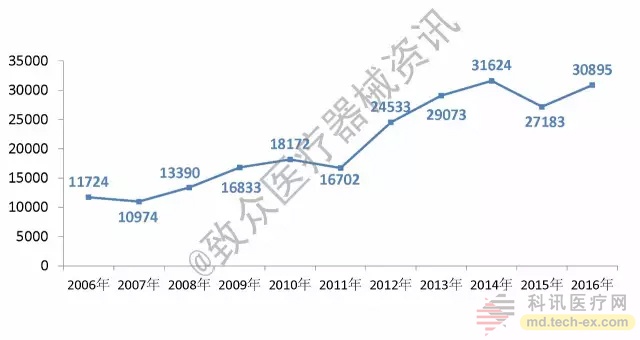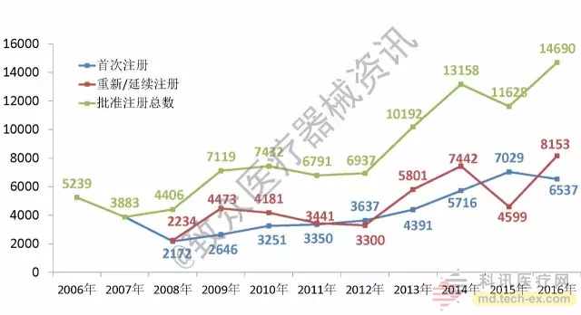 从注册总数上来看,医疗器械市场总量大体呈稳步增长的趋势,只有2015年受新法规实施等因素的影响,出现了明显的下降(见图一)。